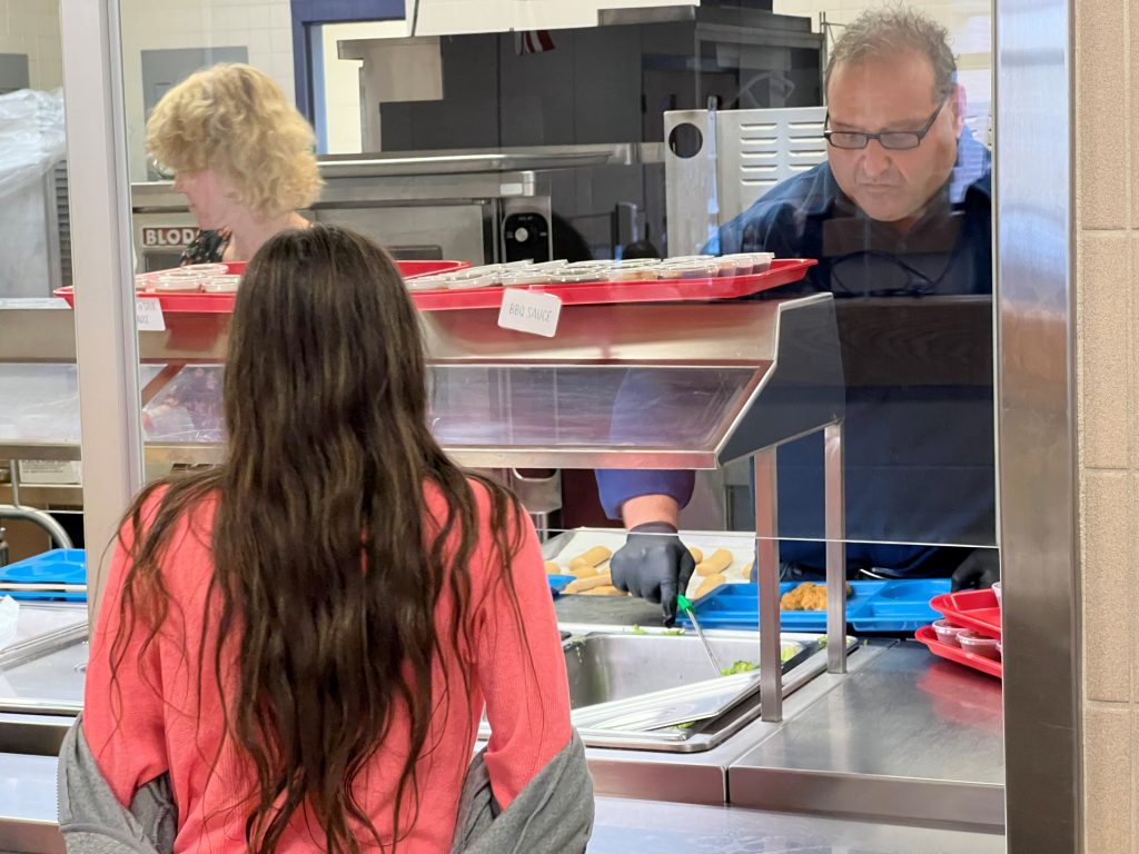 Sen. Baldacci serves lunch to students at the James F. Doughty School in Bangor for School Meals Celebration Week