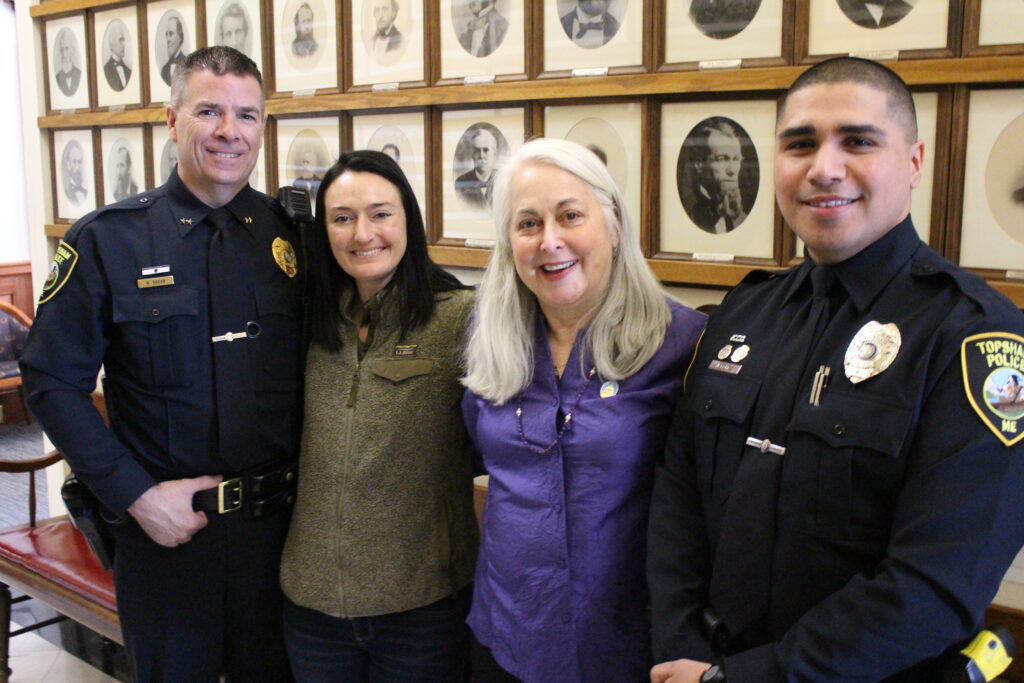 AUGUSTA — On Tuesday, February 5, Sen. Denise Tepler, D-Topsham, welcomed Topsham Police Officer Jose Gomez, Ashley Gomez, and Topsham Police Chief Marc Hagan to the State House. Sen. Tepler co-sponsored a legislative sentiment for Officer Gomez’s bravery on New Year’s Eve on the Merrymeeting Bridge, where he saved an individual in crisis.