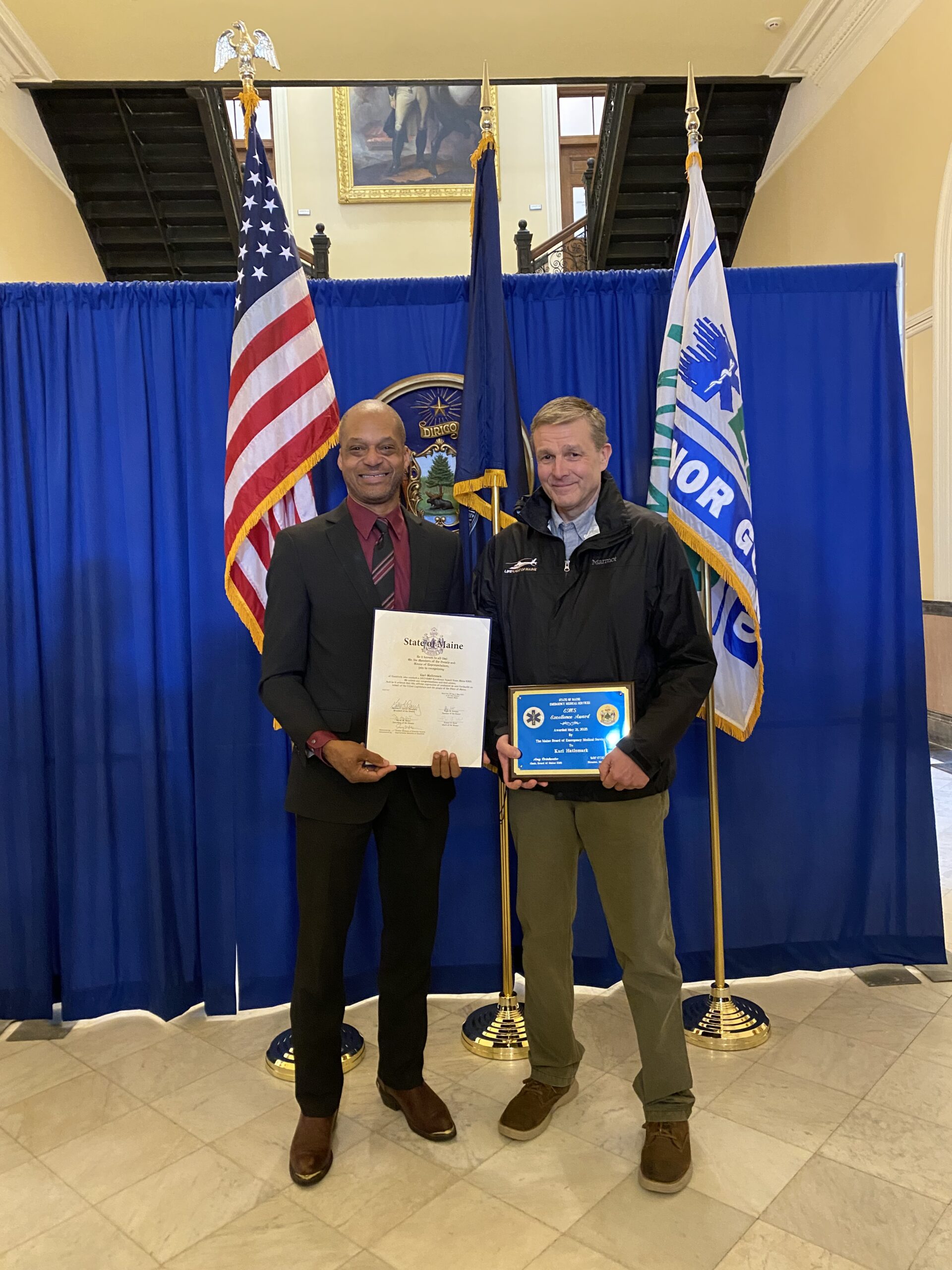 Senator Craig Hickman of Winthrop and Karl Hatlemark with Karl’s legislative sentiment and Maine EMS award in the Hall of Flags on May 21