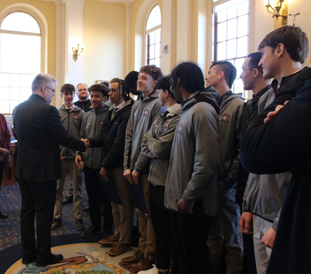 Sen. Nangle greeting the Windham Boys Basketball team in the Senate Chamber.
