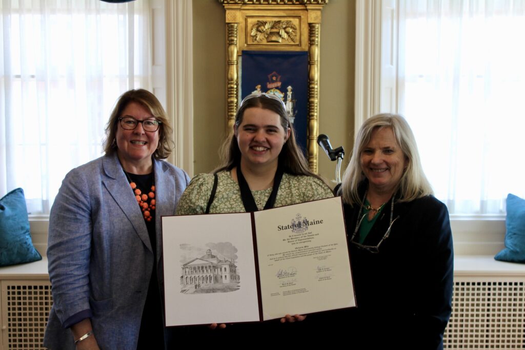 On Wednesday, April 23, Senate Majority Leader Teresa S. Pierce, D-Falmouth, and State Rep. Anne Graham, D-North Yarmouth, recognized the 2025 Central Maine Community College (CMCC) Student of the Year, Tori Wile of Gray, and presented her with a legislative sentiment at a ceremony at the Blaine House. Tori was one of seven students selected from the Maine Community College System to earn this award.